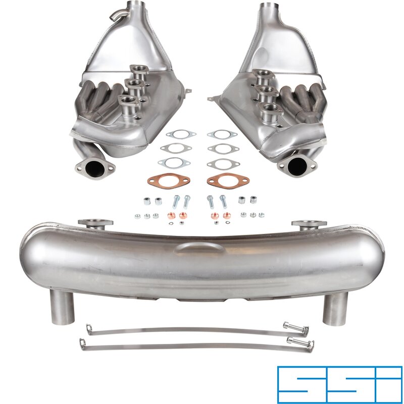 Exhaust set, Racing, with two Ø63.5 mm tail pipes. Including “Big Bore” heat exchangers with Ø41 mm tubes. For 2.7/3.0 models also add oil tubes and remove lower rear panel
