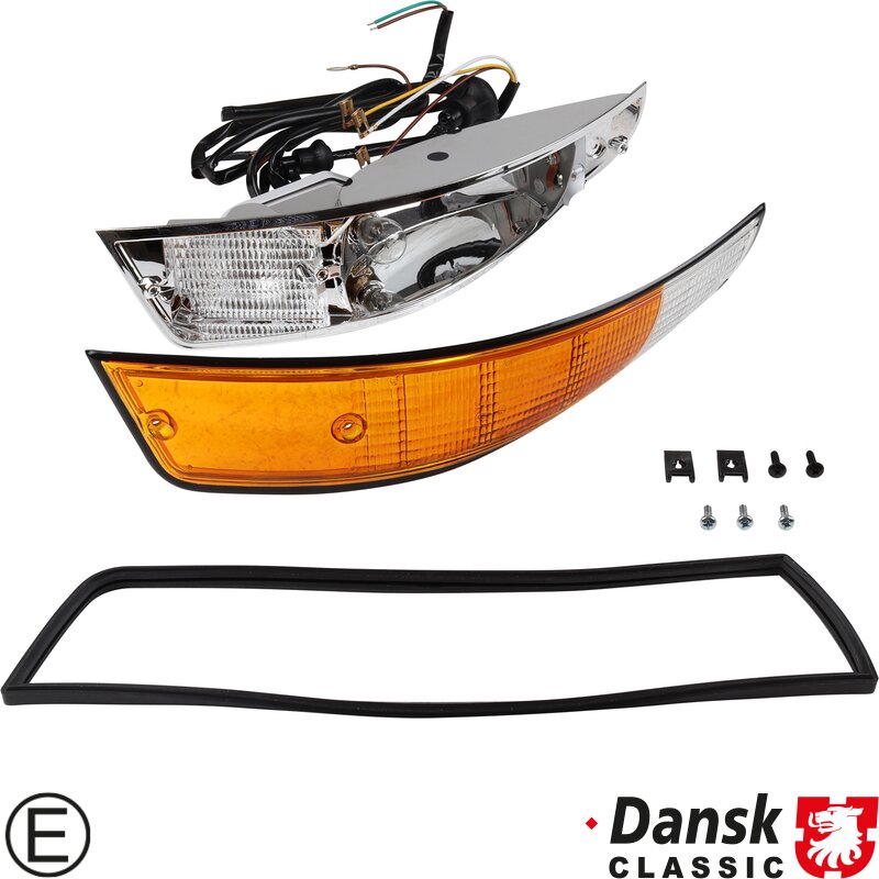 Indicator with black rim, front, complete with metal housing, with E-mark, left